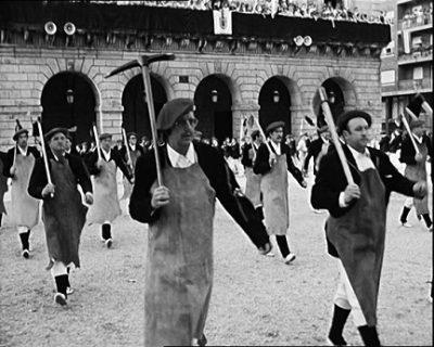 Año 1992. La Escuadra de Hacheros del Alarde de San Marcial de Irún evolucionando en la plaza de San Juan en 1992 fuente Escuadra Hacheros