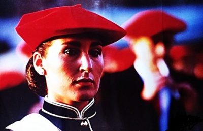 Año 1991. Raquel Jiménez Hernández. Cantinera de la Banda de Música del Alarde de Hondarribia desfilando 1991 fuente Banda de Música