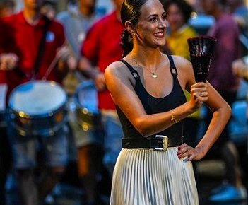 Año 2003. Adriana Troncoso Carranza. Cantinera de la Compañía Mixta del Alarde de Hondarribia saludando en el año 2003.