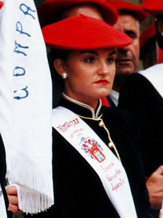 Año 1998. Ainara Basurko Sagasti. Cantinera de la Compañía Uranzu del Alarde de San Marcial de Irún atenta en el año  1998