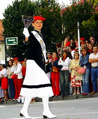 Año 2003. Ainara Iza Sagarzazu. Cantinera de la Compañía Kosta del Alarde de Hondarribia dirigiéndose a la puerta de Santa María en 2003.