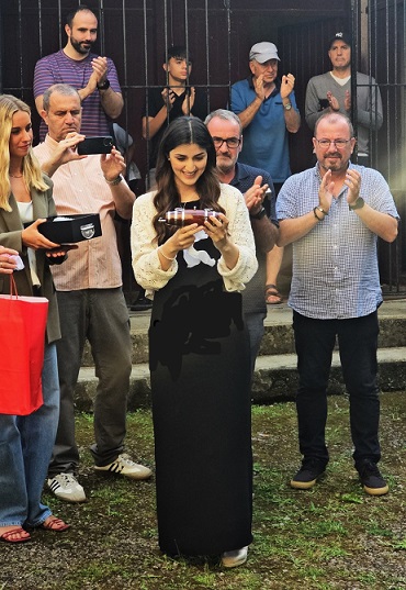 Año 2025. Ainara Oyarzabal Dip. Cantinera de la Compañía Anaka del Alarde de San Marcial de Irún recibiendo el barrilito en 2025