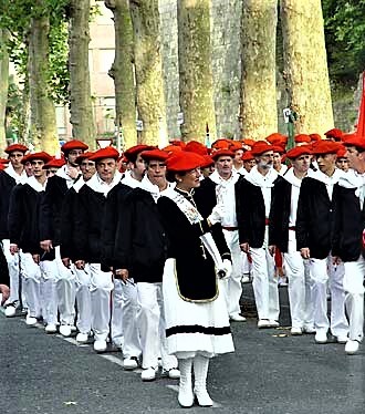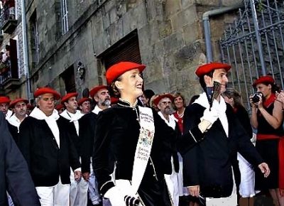 Año 2004. Aintzane Fernández Dorronsoro. Cantinera de la Tamborrada del Alarde de Hondarribia desfilando en el año 2004.