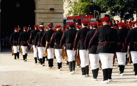 Año 1998. la Escuadra de Hatxeros del Alarde de San Marcial entrando en la plaza de San Juan en esta imagen de marcialidad en 1998 fuente Escuadra Hatxeros