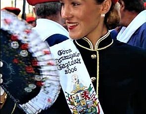 Año 2009. Alaia Aguesse Mauleon. Cantinera de la Compañía Olearso del Alarde de Hondarribia en el Zapatero del 2009.