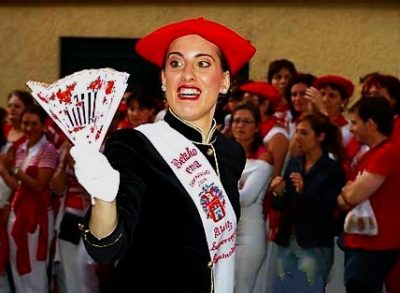 Año 2004. Alaitz Susperregi Aseguinolaza. Cantinera de la Compañía Belaskoenea del Alarde de San Marcial de Irún con abanico en 2004.