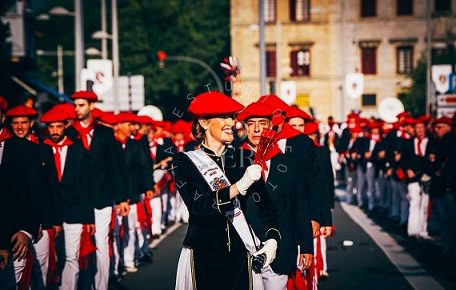 Año 2015. Maider García de Alba. Cantinera de la Compañía San Miguel del Alarde de San Marcial de Irún en la Revista de Armas del año 2015. fuente Cia San Miguel