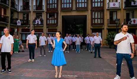 La Compañía Santiago, con su Cantinera Alazne Iribarren. Se dirigen desde su barrio a la concentración de tropas en la Plaza Urdanibia. Año 2007.