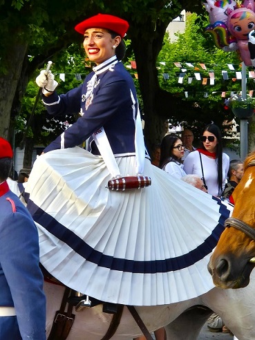 Año 2024. Alba Iglesias García. Cantinera de la Batería de Artillería del Alarde de San Marcial de Irún saludando en 2024