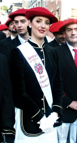 Año 2008. Ana Egiazabal Arruabarrena. Cantinera Compañía Ventas del Alarde de San Marcial de Irún en la plaza San Juan en el año 2008.