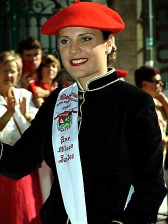 Año 2005. Ane Mitxeo Santos. Cantinera de la Compañía Bidasoa del Alarde de San Marcial de Irún desfilando en el año 2005.