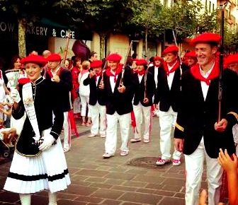 Año 2017. Añes Alkain Mitxelena. Cantinera de la Compañía Gora Arrantzale Gazteak del Alarde de Hondarribia, rodeada de amigos, en el año 2017