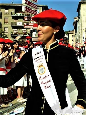 Año 2005. Arantza González Elorz. Cantinera de la C0mpañía Real Unión del Alarde de San Marcial de Irún sonriendo en el año 2005.