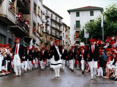 Año 1992. Beatriz Balda Martinez. Cantinera de la Compañía San Miguel del Alarde de San Marcial de Irún en la bajada a la Iglesia en 1992