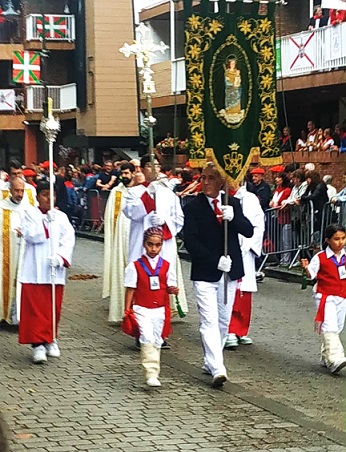 Año 2002. Cabildo eclesiástico encabezado por el estandarte de la Virgen acompañán al Alarde de Hondarribia en 2002 fuente Festak