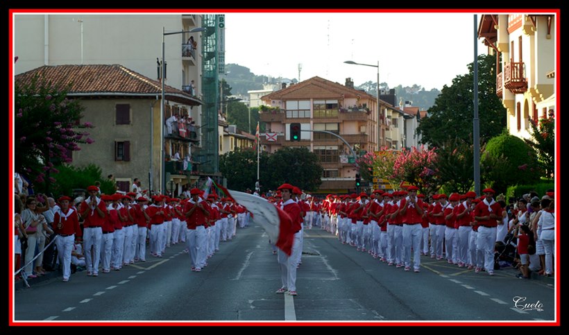 La Compañía Gora Ama Guadalupekoa con su Abanderado. Capitán Angel Aramendi Jauregi. Desfilando por la mañana. Fotografía de Maialen Cueto. Año 2013