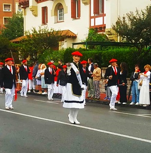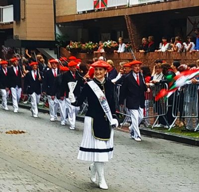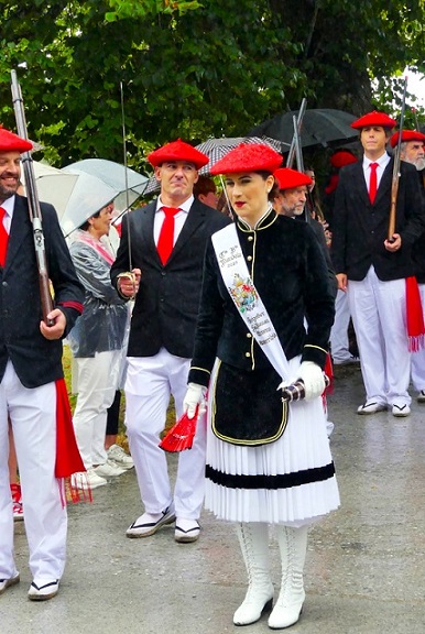 Año 2025. Goizeder San Roman Extremo. Cantinera de la Compañía Mendelu del Alarde de Hondarribia al paso por Damarri en 2025 fuente archivo