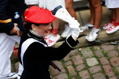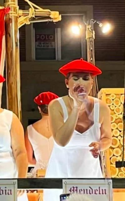 Año 2025. Goizeder San Roman Extremo. Cantinera de la Compañía Mendelu del Alarde de Hondarribia eufórica 2025 fuente DV