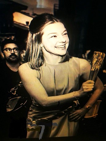 Año 2025. Ines La Casta Aramburu. Cantinera de la Compañía Olearso del Alarde de Hondarribia saludando en el año 2025 fuente DV