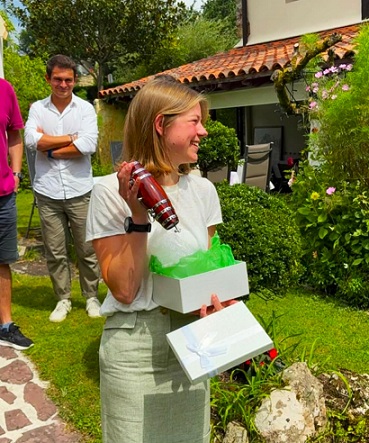 Año 2025. Ines la Casta Aramburu. Cantinera de la Compañía Olearso del Alarde de Hondarribia en la entrega barril 2025 fuente Cia Olearso