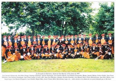 Año 1997. La Escuadra de Hatxeros del Alarde de San Marcial de Irún posando en esta foto de grupo en 1997 fuente Escuadra Hatxeros