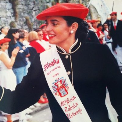 Año 1994. Rosa Mª Zabalo Urtxegi. Cantinera de la Compañía Meaka del Alarde de San Marcial de Irún contenta en 1994 fuente R. Zabalo