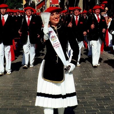 Año 2005. Edurne Petrikorena Simón Cantinera de la Compañía Meaka del Alarde de San Marcial de Irún en la Calle Mayor en el año 2005. fuente Edurne Petrtikorena