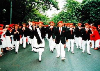 Año 1997. Julia Ollo Esparcia. Cantinera de la Tamborrada del Alarde de San Marcial de Irún desfilando en el año 1997 fuente Tamborrada