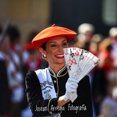 Año 2023. Naiara Nicolás Sagarzazu. Cantinera de la Compañía Arkoll del Alarde de Hondarribia saludando en el año 2023. foto Josean Arregui