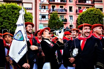 Año 2023. Juncal Pombar Casado. Cantinera de la Compañía Buenos Amigos del Alarde de San Marcial de Irún en la Plaza San Juan en el 2023 foto Nuria Córdoba