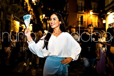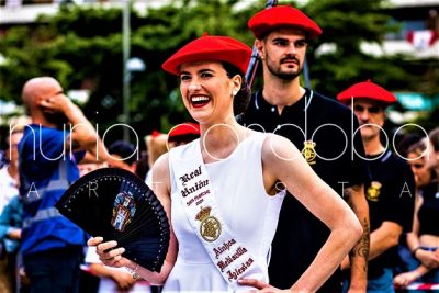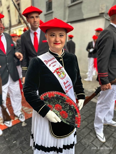 Año 2023. Anne Rocha Urtizberea. Cantinera de la Compañía Ama Shantalen del Alarde de San Marcial de Irún en la revista de Armas del año 2023 foto Nuria Córdoba