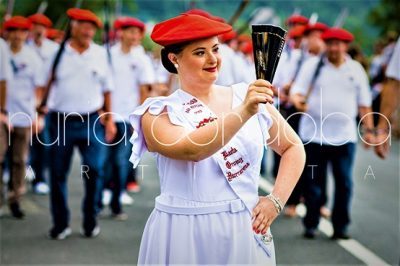 Año 2023. Marta Oronoz Biurrarena. Cantinera de la Compañía Bidasoa del Alarde de San Marcial de Irún en la Revista de Armas del 2023. foto Nuria Córdoba