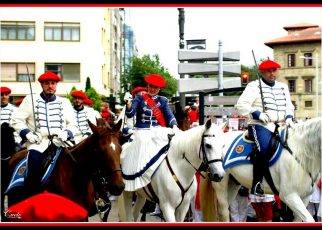 Año 2001. Idoia Lorente Álvarez. Cantinera de la Compañía Lapice del Alarde de San Marcial de Irún en la calle Mayor en 2001 Marina Aguinagalde