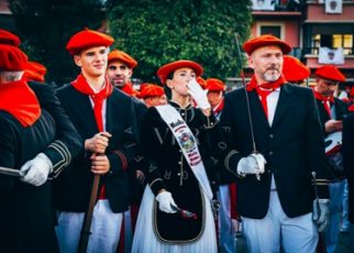 La compañía Ama Shantalen, primera fila de escopetas, con su guapa cantinera Amaia Martín, la tarde de san Pedro en la Revista de Armas. Año 2010.