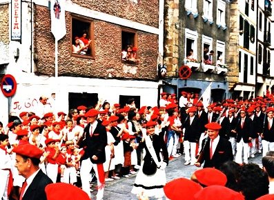 La cantinera de la Compañía Azken Portu saliendo del Junkal. Con la música de la Subida de la Iglesia Ane García sube ligera y sonriente. Año 2013