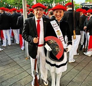 La Compañía Bidasoa con su Cantinera Irene Rollán. Bajando la calle mayor con su cantinera y la Bandera de Irún. ¡Momentazo! Fotografía de Íñigo Salcedo. Año 2019