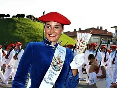 Año 2008. Dorleta Díaz alza. Cantinera de la Compañía Beti Gazte del Alarde de Hondarribia saludando en el año 2008.