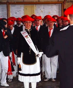 Año 2002. Edurne Mitxeo Santos. Cantinera de la Compañía Bidasoa del Alarde de San Marcial de Irún en los arkupes del Ayuntamiento en 2002
