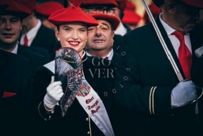 Año 2025. Eider Zuzaya Pagola. Cantinera de la Compañía Olaberria del Alarde de San Marcial de Irún con abanico en 2025