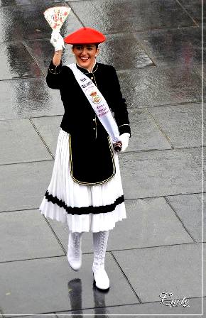 Año 2017. Elena Murga Martínez. Cantinera de la Compañía Real Unión, del Alarde de San Marcial de Irún, entrando en San Juan en el año 017.
