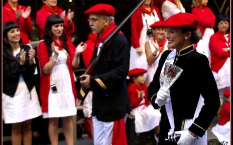 Año 2008. Erika Pikabea Aiestarán. Cantinera de la Compañía Jaizubia del Alarde de Hondarribia desfilando en el monte el año 2008.