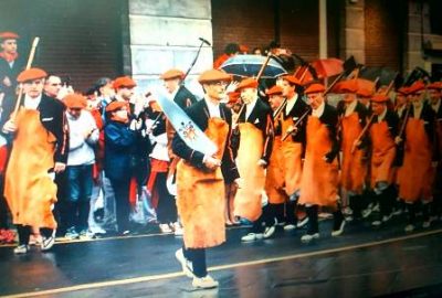 Año 2017. Juanjo Martínez. Cabo de la Escuadra de Hacheros del Alarde de San Marcial de Irún, realizando la evolución para entrar en San Juan , año 2017.