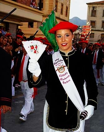 Año 2004. Estibaliz Etxeberria Portero. Cantinera de la Compañía Ama Shantalen del Alarde de San Marcial de Irún desfilando desde San Juan en 2004.
