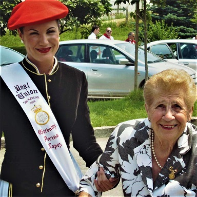 Año 2006. Estibaliz Peciña López. Cantinera de la Compañía Real Unión del Alarde de San Marcial de Irún acompañada de la familia en el año 2006.