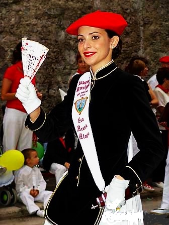 Año 2004. Eva Arana Alonso. Cantinera de la Compañía Buenos Amigos del Alarde de San Marcial de Irún sonriendo en 2004.