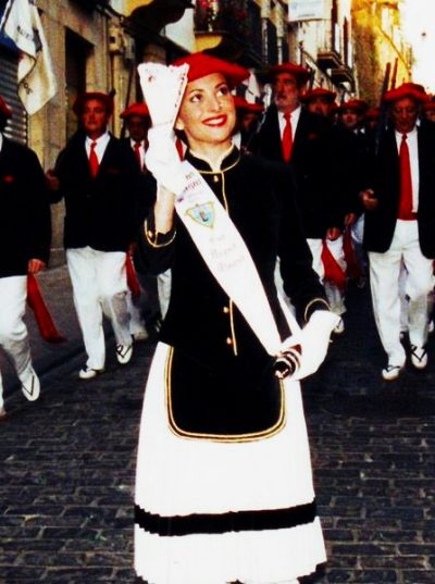 Año 2004. Eva Arana Alonso Cantinera de la Compañía Buenos Amigos del Alarde de San Marcial de Irún saludando en el año 2004.