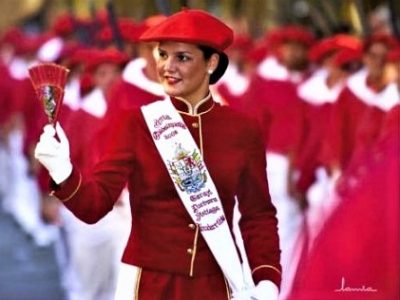 Año 2008. Garazi Lurburu Sistiaga. Cantinera de la Compañía Ama Guadalupekoa del Alarde de Hondarribia saludando en el año 2008.