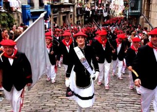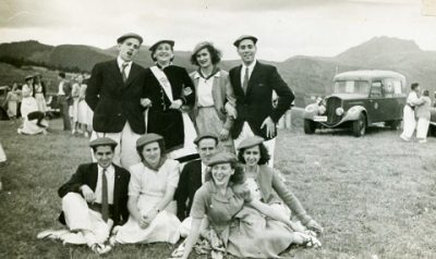 Año 1948. Gloria Larrañaga Aizpuru. Cantinera de la Banda de Música del Alarde de San Marcial de Irún con grupo de amigos