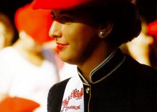 Año 2013. Irati Figueroa López. Cantinera de la Compañía Ama Guadalupekoa del Alarde de Hondarribia saludando en el año 2013.