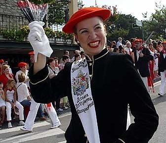 Año 2024. Itsasne Duinat Berrotaran. Cantinera de la Compañía Montaña del Alarde de Hondarribia al paso por Damarri en el año 2024